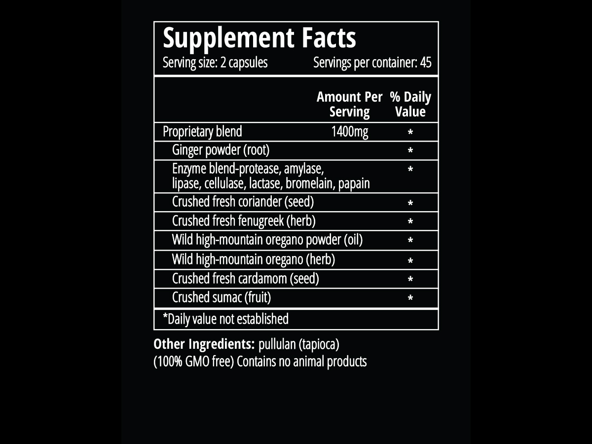 Ingredients Ginger powder (root), Enzyme blend-protease, amylase, lipase, cellulase, lactase, bromelain, papain, crushed fresh coriander (seed), crushed fresh fenugreek (herb), wild high-mountain oregano powder (oil), wild high-mountain oregano (herb), crushed fresh cardamom (seed), crushed sumac (fruit). Other ingredients: Pullulan (tapioca) (100% GMO Free, contains no animal products)